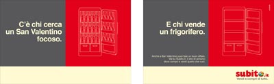 Dopo l’affissione nelle linee metropolitane di Roma e Milano, la stampa quotidiana e la prossima uscita sul web, Subito.it crea una comunicazione ad hoc per San Valentino. Le nuove creatività dedicate alla festa degli innamorati hanno lo stesso format delle comunicazioni precedenti: illustrazioni dal tratto sintetico, tono di comunicazione ironico e semplice con headline legate a temi di attualità. Il messaggio finale della comunicazione, pianificata su free press e quotidiani nazionali, è che su Subito.it è sempre facile fare affari, anche a San Valentino.
