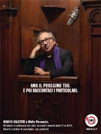 Da qui l’idea creativa: Marco Balestri appare in abiti liturgici, tonaca nera e stola viola, nel confessionale di una chiesa.... “C’è solo un problema. Non tiene il segreto”. Le headline e gli slogan scelti per la campagna, in stretta relazione con le immagini del conduttore, svelano infatti subito che non si tratta di un prete tradizionale: “Più che fedeli, ha ascoltatori fedeli”; “Meno siete casti, più si diverte” e “Ama il prossimo tuo. E poi raccontaci i particolari”.