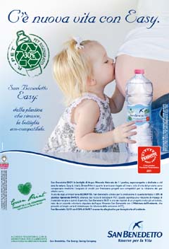 L’immagine tenera di una bimba davanti al pancione della mamma in attesa di un fratellino, con il claim 'San Benedetto Easy: dalla plastica che rinasce, la bottiglia eco-compatibile', spiega al consumatore la filosofia sottesa al percorso che sta dietro a questa bottiglia, attualmente la più venduta in Italia nel segmento 'acqua naturale 1L PET', con una quota di mercato superiore al 50%. Orgogliosa di aver tagliato il traguardo del 30% di PET rigenerato, 'Easy' è on air dal 20 luglio sulle pagine dei più importanti quotidiani italiani.