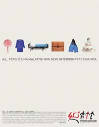 L'associazione italiana contro le leucemie, linfomi e mieloma, festeggia i suoi 40 anni di attività con una grande cerimonia presso i Giardini del Quirinale. Per l'agenzia, che firma il nuovo spot istituzionale, hanno lavorato Alfredo Ruggieri (copy), Fabrizio Grillotti (art), Anna Mochi Onori (copy) e Loredana Cusatis (art), sotto la direzione creativa di Alessandra Amigoni, e la direzione creativa esecutiva di Pietro Maestri.