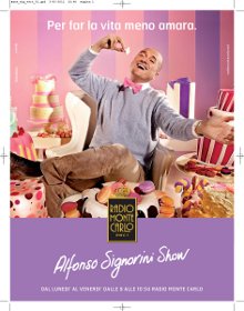 La nuova campagna advertising della trasmissione radiofonica ”Alfonso Signorini Show”, al via in questi giorni, ritrae il conduttore, Alfonso Signorini, in un’immagine patinata e colorata, immerso tra torte, bon-bon e macarons. Un concept creativo che punta su una profusione di colore e leccornie per un claim che, non a caso, recita: ”Per far la vita meno amara”.L’obiettivo della campagna è quello di utilizzare una comunicazione “patinata e allegra”, visibile sui maggiori quotidiani, settimanali e mensili nazionali da lunedì 7 febbraio.