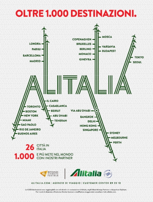 Alitalia lancia oggi, 18 novembre, una nuova campagna di comunicazione focalizzata sul network di oltre 1.000 destinazioni offerte dalla compagnia insieme ai vettori partner di SkyTeam ed Etihad Airways Partners, compagini nelle quali Alitalia gioca un ruolo centrale.
