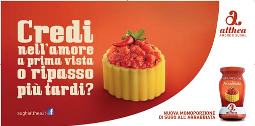 Il nuovo pay-off, “Amore e sughi”, esprime la passione per il lavoro e l’attenzione alle persone che ritroviamo nei sughi, come nella comunicazione Althea. In questa prima fase, l’azienda si rivolge ai single lanciando i “Monoporzione” con una campagna dal linguaggio caldo e diretto.