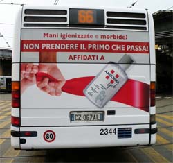 Con un allestimento totale, esterno e interno, il prodotto accompagnerà i passeggeri dei bus di Napoli, Firenze, Torino e Genova invitandoli a riflettere sulla necessità di avere sempre l’igiene 'a portata di mano'. Inoltre, nelle stazioni delle metropolitane di Milano e Roma saranno allestiti dei punti Amuchina. Direzione creativa di Piero Reinerio.