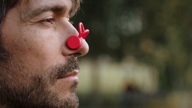 L’idea è quella di siglare il disagio provocato dal senso di apnea dovuto al naso chiuso con una simbolica pinza