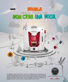 Da novembre è on-air la nuova campagna per Favola, la macchina del sistema espresso Lavazza A Modo Mio, realizzata in collaborazione con Electrolux. Periodici e quotidiani, maxi-affissioni speciali, materiali punto vendita e un video web da più di un minuto raccontano il lancio della nuova macchina per espresso Lavazza. Favola, la nuova macchina espresso Lavazza, atterra in una dimensione surreale fatta di carta, creando scompiglio e felicità tra tutti i protagonisti delle favole. Così tra velieri che volano tra le nuvole, polpi e gnomi che portano le cialde, topolini che rubano cucchiaini, bustine di zucchero che si trasformano in tappeti volanti, streghe, principesse, uccellini, carrozze, pifferai e castelli la macchina per espresso fa il suo esordio, sottolineato anche dall’head-line “Non c’era una volta”.