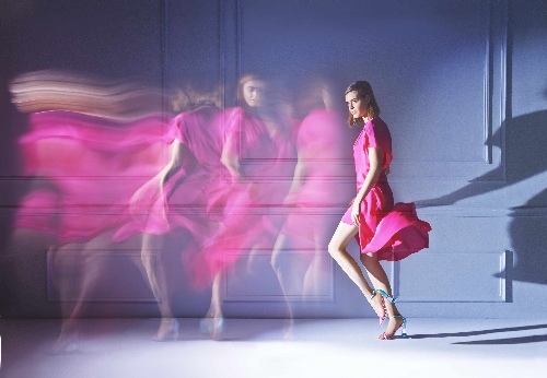 Protagonista del soggetto principale della campagna è il sandalo in ayers caratterizzato da originali cinturini intrecciati fuxia, viola e azzurro e solido tacco in plexiglass dalle trasparenti nuances.