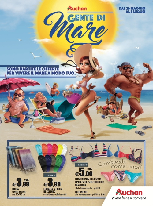 Dieci personaggi accompagneranno i clienti del colosso francese della GDO all’interno dei vari punti vendita per tutta la durata dell’operazione, da oggi (26 maggio) al 3 luglio, ma il loro ruolo principale sarà quello di caratterizzare l’ampia offerta di Auchan riguardante prodotti per le vacanze marittime e non. Così “Misspiaggia” sarà la testimonial di prodotti come i costumi da bagno e le borse da mare, “i Comodi” di ombrelloni, borse frigo e sdraio, “il Surfista” di tavole, maschere, pinne e kayak, “il Piccolo Architetto” dei giochi per i bambini. Perché identificarsi con questi personaggi è, in effetti, molto divertente. L’offerta Auchan sarà completata da creme solari e integratori, infradito, bermuda, t-shirt, teli, piscine gonfiabili e rigide di varie dimensioni, tecnologia a prova di salsedine, come fotocamere resistenti all’acqua e tutto ciò che serve per “vivere il mare a modo tuo”.