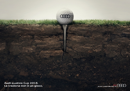 Per comunicare la XXV edizione del torneo e invitare tutti gli appassionati a partecipare, scende in campo una creatività che esalta la potenza, la precisione e tutto il controllo della trazione integrale quattro di Audi. Con un key-visual sintetico ma dal grande impatto visivo, alla Casa dei quattro anelli basta una pallina da golf per raccontare la forza con cui la sua trazione inchioda al terreno. Perché qualunque sia il campo di sfida, per Audi 'La trazione non è un gioco'.
