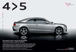 La campagna stampa si concentra sull’assunto, tanto incisivo quanto paradossale, che 4 è maggiore di 5: è infatti la trazione quattro che dà un valore aggiunto ad Audi A5 e che va ad arricchire, quindi, un modello già perfetto in termini di design, tecnologie e prestazioni.