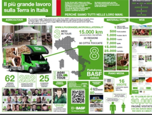 Dal mese di maggio, il progetto italiano ideato e organizzato dall’agenzia di comunicazione, si è articolato attraverso una campagna stampa mirata; un tour (l’”Agricoltour”) che in 3 mesi ha percorso in Italia 15.000 chilometri toccando 60 città e intervistando 250 operatori, e una piattaforma web dedicata www. ilpiugrandelavorosullaterra.it .