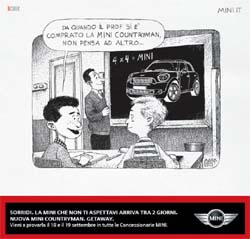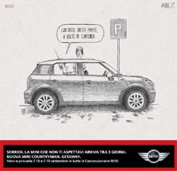 Si è conclusa sabato 18 l'iniziativa speciale che Bcube ha realizzato per Mini in collaborazione con La Repubblica. In occasione del lancio della nuova Mini Countryman, che è avvenuto proprio sabato 18 e domenica 19, l'agenzia guidata da Francesco Bozza ha affidato a un team di cartoonist (Lady Dega, Frank Rough, Mark Kent e Brown Winkel) supervisionato da Renato Sorrentino, la realizzazione di 4 vignette: quattro stili diversi raccontano attraverso quattro battute fulminanti la Mini Countryman e le sue innovative caratteristiche (le 4 porte, la spaziosità, le 4 ruote