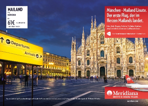 Un’altra creatività è stata ideata per la campagna pianificata a Monaco. Questa volta il target include anche i passeggeri leisure, che viaggiano sul capoluogo lombardo per turismo e shopping. Con Meridiana sei subito nel cuore di Milano, il plus comunicato.