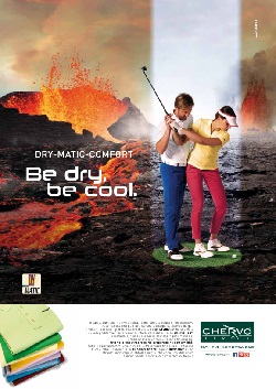 Chervò, azienda italiana attiva nella produzione di abbigliamento e accessori per il golf, lo sport e il tempo libero, ha realizzato una nuova campagna pubblicitaria, dedicata ad una delle sue principali tecnologie brevettate, Dry-Matic, per la collezione primavera-estate 2015.Da aprile sulla stampa italiana e internazionale, caratterizzata da una headline incisiva 'Be dry, be cool', la campagna presenta due soggetti: il primo ha come protagonista una giovane donna, che indossa un outfit grintoso e decisamente 'fuori dalle righe' rispetto al classico abbigliamento da green, si appresta a tirare un colpo con fare seducente; il secondo, la stessa ragazza con un partner, intento a insegnarle le tecniche golfistiche, con un look più 'classico'.