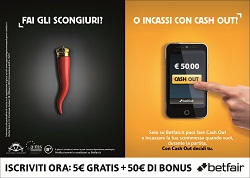 'O ti affidi agli scongiuri, o incassi con Cash Out'. Questo uno dei messaggi della campagna adv press dedicata all’esclusivo prodotto di Betfair, partita oggi, 21 ottobre, su Gazzetta dello Sport.Ideata da Brand Portal, la campagna prevede a rotazione quattro soggetti: un cornetto portafortuna, un telecomando, una schedina di scommesse accartocciata e una pantofola. Tutti invitano l’utente a non rimanere in balia della sorte o passivo nella scommessa, ma ad interagire. Con Cash Out 'decidi tu' il momento migliore per incassare la tua vincita, come recita il claim del prodotto.