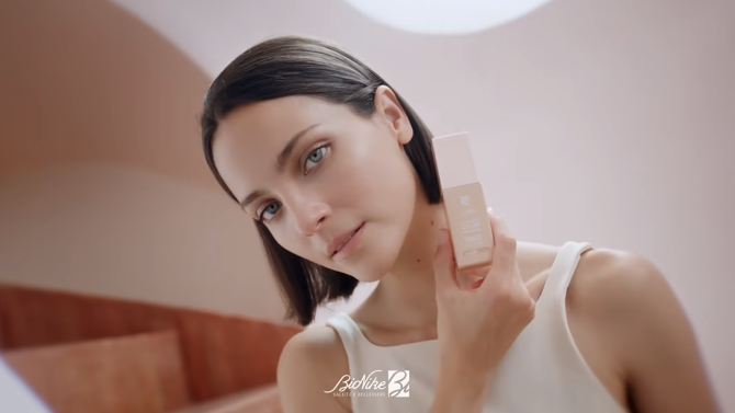 Nello spot la protagonista è immersa in un ambiente suggestivo, caratterizzato da un raffinato gioco di luci che richiama il riflesso dell’acqua, metafora diretta dell’idratazione che illumina e valorizza l’incarnato.