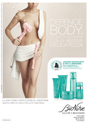 Questa metafora visiva ha l'obiettivo di sottolineare il mix di forza e delicatezza che contraddistingue i prodotti della linea BioNike: forti nel trattare gli inestetismi, ma delicati con la pelle. Le qualità della linea BioNike Defence Body vengono così comunicate evocando il lato artistico del corpo femminile e mettendo il target in una posizione attiva per suscitare un sentimento di aspirazionalità nei confronti del brand.
