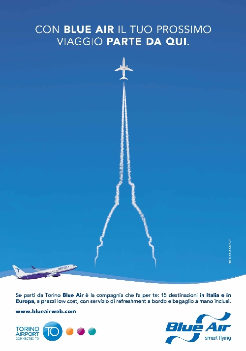 La campagna multicanale esalta la partnership tra Blue Air e lo scalo torinese, che grazie alle 15 mete previste da questa collaborazione svilupperà un terzo del suo traffico passeggeri complessivo. Le declinazioni più tattiche si focalizzano sul dettaglio delle singole rotte del network: nazionali, europee, mete estive. Direzione creativa a cura di Stefano Battistelli.