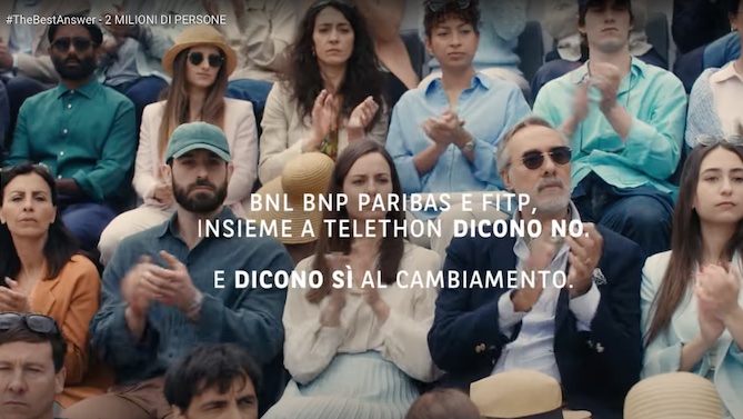 La creatività si basa sull’atteggiamento tipico che ha il pubblico sugli spalti mentre assiste a una partita di tennis. Il volto si gira continuamente da una parte all’altra del campo per seguire il gioco, mimica che può essere tradotta nella espressione universale del “no”. La sfida su cui BNL e FITP prendono una posizione concreta è dire Sì alla ricerca scientifica per lo studio e la cura delle malattie genetiche rare invitando a donare insieme, a sostegno di Fondazione Telethon.