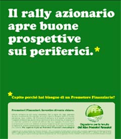 Gli annunci (tre, a rotazione) ironizzano sulla complessità del gergo finanziario utilizzato oggi anche dai media che si rivolgono al grande pubblico (per esempio, “Corporate bond dei Bric favoriti da spread più ridotti”) ed evidenziano la necessità di rivolgersi a un Promotore Finanziario per chiarirsi le idee e assumere scelte consapevoli (“Capito perché hai bisogno di un promotore finanziario?”). L’agenzia realizzerà anche materiali da distribuire agli eventi cui parteciperà l’Apf (tra questi il Salone del Risparmio e l’ITForum) impegnandosi anche in attività di ufficio stampa a supporto del lancio della campagna, nella gestione dell’attività media e nella realizzazione di un video virale.