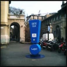 Si è conclusa domenica 22 gennaio con il secondo weekend a "porte aperte" nei saloni la campagna curata da Caleidos Teenagency per il lancio della più piccola nella scuderia Volkswagen, commissionata da un circuito di concessionarie che comprende Autorigoldi, F.lli Giacomel, Lombarda Motori, Pirola F. & Figli, R.O.A.R., Sagam e Sesto Autoveicoli. Per trasmettere il vissuto ad alto contenuto tecnologico del nuovo modello e il servizio maps+more che lo caratterizza - con mappe sociali aggiornabili dalla community degli utenti up! - l'agenzia ha trasferito nel mondo reale i segnaposto che indicano i punti d'interesse nelle mappe su internet: giganteschi punti esclamativi blu, simbolo di up!, sono apparsi a segnare il territorio a Milano e dintorni. Qui i passanti venivano invitati a recarsi negli up! store (i saloni Vokswagen coinvolti nell'iniziativa) per provare l'auto e partecipare a un concorso che mette in palio 7 iPad.