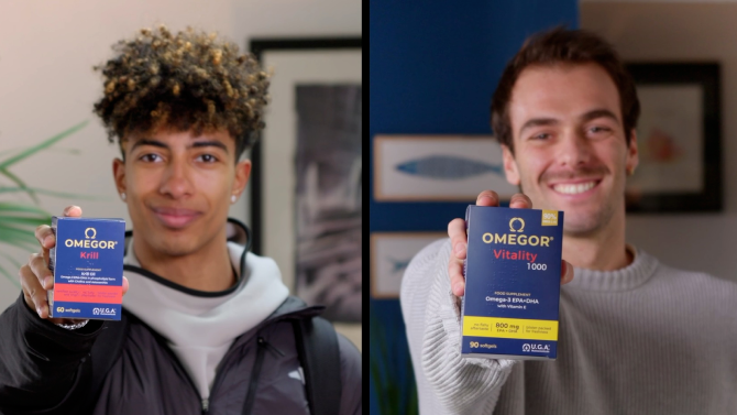 La campagna presenta i tre prodotti di punta della linea Omegor: Vitality, Krill e Veg.