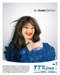 Anche quest’anno la TTT Lines, compagnia di navigazione, nota per i suoi collegamenti tra Napoli e Catania, ha chiesto allo Studio Fabris adv, storica agenzia pubblicitaria napoletana, una campagna pubblicitaria originale e divertente. L’agenzia ha puntato su una divertente headline: 'Be Transported' (Lasciati trasportare) e come visual vede una 'improbabile' donna … che invita i clienti a lasciarsi trasportare comodamente da Napoli a Catania e viceversa. Ovviamente nella parola transported è volutamente evidenziata la parte facilmente ricollegabile al visual.