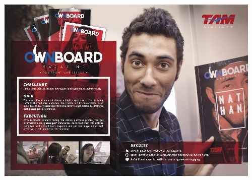 In occasione dell’ottavo anniversario della sua rotta di collegamento diretto tra Milano e San Paolo,Tam Airlines ha deciso di puntare sui propri valori fondanti: innovazione e costante miglioramento dei servizi al passeggero, creando con l’aiuto di Fcb Milan “The OwnBoard Magazine”, la prima rivista di bordo totalmente personalizzata grazie ad un uso intelligente dei dati “social” dei passeggeri. Introducendo un facebook connect durante la fase di acquisto online del biglietto è stato infatti possibile conoscere meglio i gusti, le passioni e le preferenze dei singoli passeggeri. Questi dati, incrociati data e luogo di destinazione, sono diventati contenuti personalizzati diversi per ciascun passeggero, così come diversa e unica è ogni copia di The OwnBoard Magazine.
