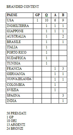 (Dalla nostra invita Elena Colombo). Che al Festival di Cannes fosse tempo di creare la sezione riservata al Branded Content è testimoniato dalle 800 entries registrate quest'anno, 87 delle quali ammesse in shortlist e 56 premiate con i Leoni. Una sezione che ha giudicato le campagne iscritte sulle base della capacità di generare nei consumatori reazioni e comportamenti a contenuti veicolati attraverso diverse piattaforme.