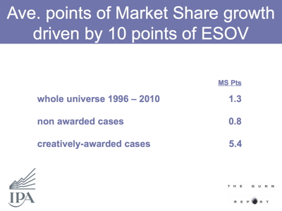 Come indica la tabella qui sopra, in tutte le campagne dal 1996 al 2010 che Giunn ha preso in considerazione, verificando quanti punti di market share è possibile guadagnare grazie a 10 punti in più di 'extra share of voice', le campagne premiate ottengono risultati quasi 5 volte superiori a quelle (pur efficaci) non premiate. Ma non solo: spezzando l'analisi in due periodi, fino al 2004 e dopo, è possibile vedere come tale influenza moltiplicatrice del ROI sia addirittura aumentata. Come a dire: in un panorama sempre più affollato e in cui acquistare share of voice aggiuntiva è sempre più costoso, essere creativi regala un vantaggio competitivo sostanziale.
