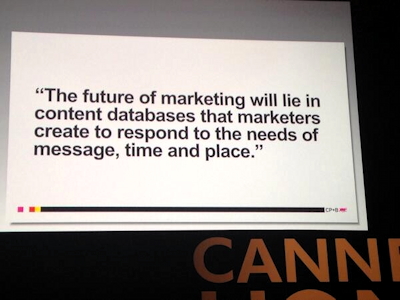 Porter ha concluso il suo intervento citando un amico-collega-cliente rimasto anonimo, perché anche lui presente a Cannes, e proiettandone la frase sul grande schermo alle sue spalle: "Il futuro del marketing sarà nella costruzione di database di contenuti creati dai brand per rispondere a qualsiasi necessità di messaggi, tempi e luoghi".