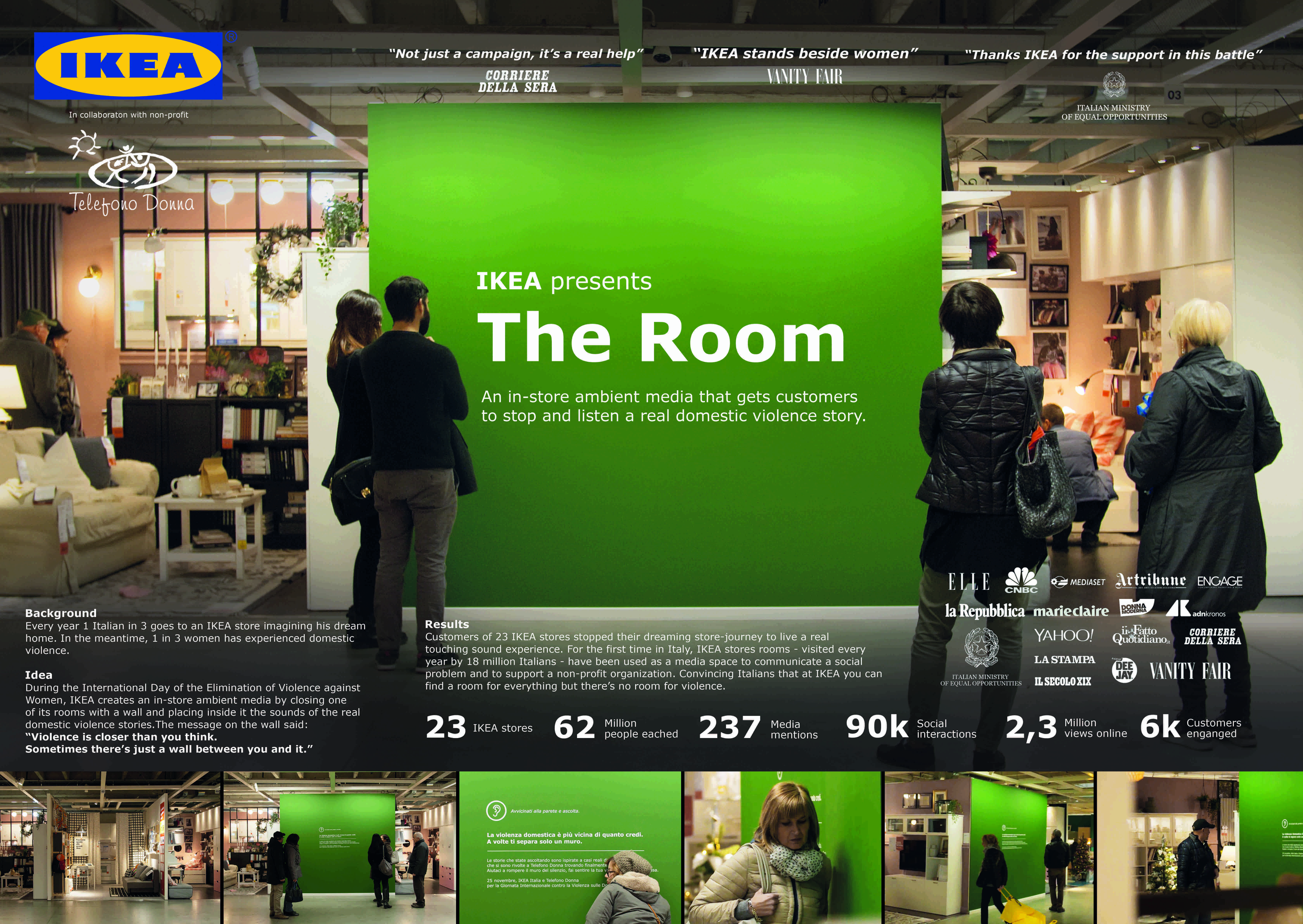 "Si è trattato di un progetto molto complesso che ha preso vita su vari media - ha affermato Cortesini - . Oltre a uno spot tv della durata di un minuto (leggi news) in vari punti vendita IKEA, a Milano, a Torino e a Roma, in occasione della giornata contro la violenza sulle donne, sono state messe in scena, grazie alla collaborazione con attori professionisti, alcune possibili violenze che le donne possono subire in casa. I suoni delle violenze erano udibili dietro una parete posta in una delle stanze, dove campeggiava la scritta 'La violenza è più vicina di quanto credi. A volte c'è solo una parete tra te e lei".