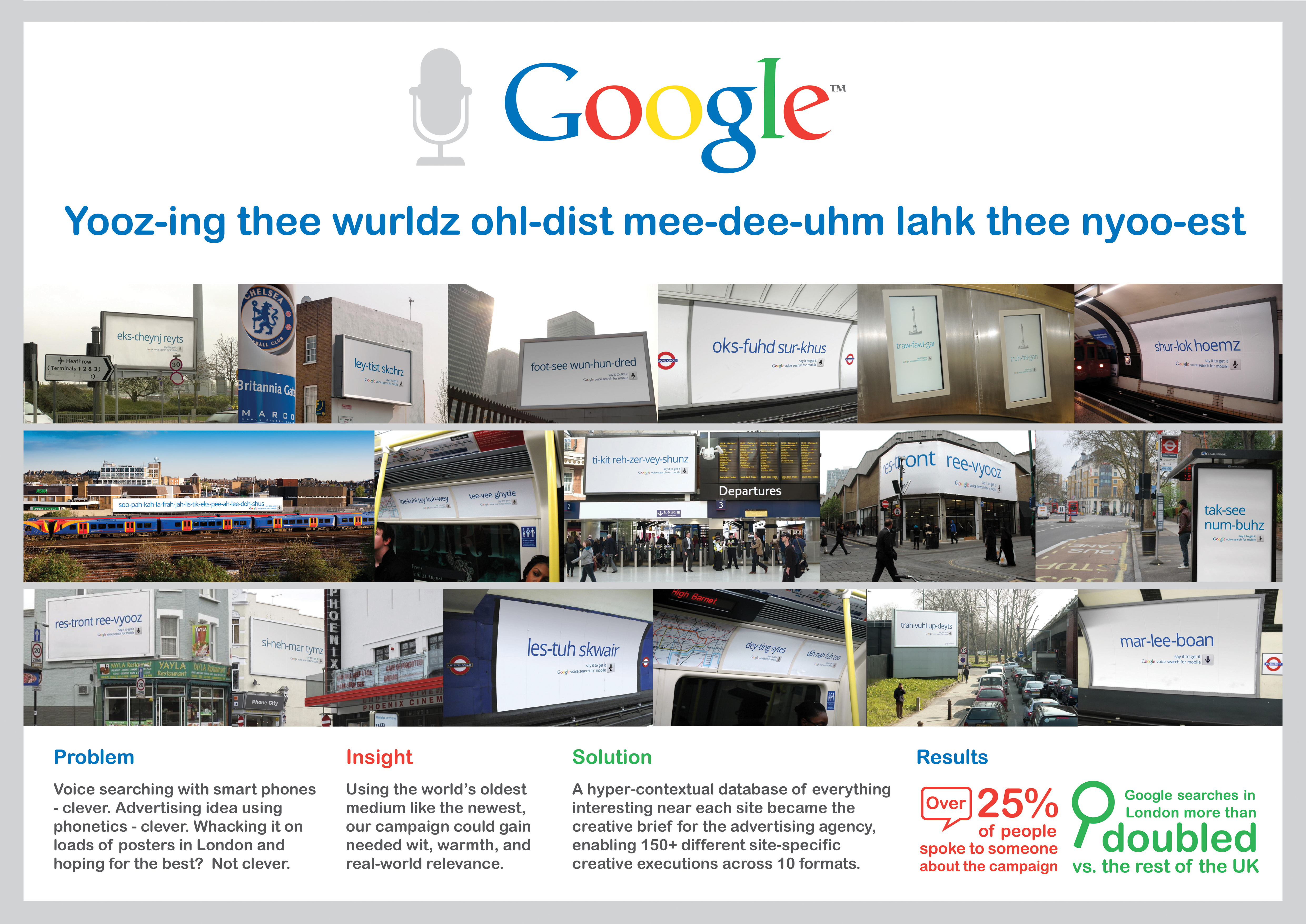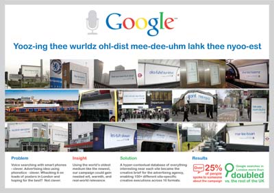 Il Grand Prix andrebbe in Uk, a 'Google Voice Search' di Manning Gottlieb Omd London per Google. (In allegato foto e didascalia).
