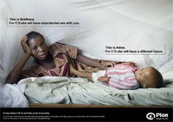 Infine, ultimo gradino del podio per la Danimarca. La coppia di creativi ha pensato a un'immagine su cui sono raffigurati, uno a fianco all'altro, una donna e un bambino, entrambi di colore. Le headline mettono a confronto due diversi utilizzi di un budget di 15 dollari: la cifra può essere utilizzata per un rapporto sessuale non protetto (come si legge nella headline sopra la donna) oppure per dare sostegno e dunque garantire un futuro iù sereno a una bambina attraverso Plan (come si legge sopra il piccolo).