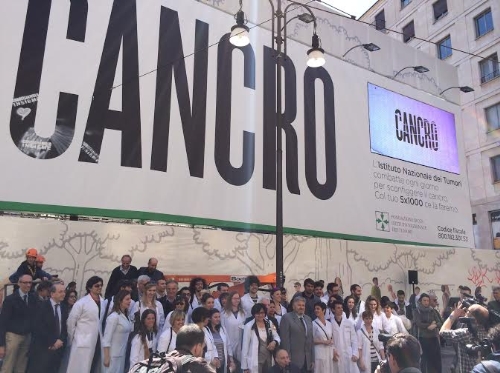 Un maxi telo di oltre 150 mq in via Torino, messo a disposizione da Acone Associati, è stato il muro sul quale writers professionisti, testimonial come Antonio Albanese, Paolo Maldini ed Emiliano Mondonico, insieme a passanti incuriositi dall’iniziativa hanno cancellato le lettere che compongono la parola cancro.