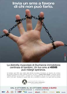 “Invia un sms a favore di chi non può farlo” recita l’headline della nuova campagna di sensibilizzazione e raccolta fondi tramite sms dell’Associazione Amici del “Centro Dino Ferrari”, che sostiene e sviluppa l’attività del “Centro Dino Ferrari”, da anni impegnato nella ricerca clinica e scientifica nel campo delle malattie neuromuscolari e neurodegenerative, tra cui la Distrofia Muscolare di Duchenne. Ideata e realizzata pro bono da Cernuto Pizzigoni & Partners, l’agenzia nata dalla storica coppia creativa, è declinata offline (stampa) e online (banner). La campagna stampa si è ispirata alla caratteristica principale della malattia, ovvero la perdita progressiva delle capacità motorie. Ed è proprio questo che l’agenzia ha scelto di rappresentare attraverso l’immagine di una mano infantile le cui dita sono avvolte da una catena che ne impedisce il movimento, anche il più semplice e, ormai, quotidiano come quello di digitare e inviare un sms con il cellulare. La direzione creativa è di Aldo Cernuto e Roberto Pizzigoni, mentre lo scatto è stato realizzato da Franco Berra.