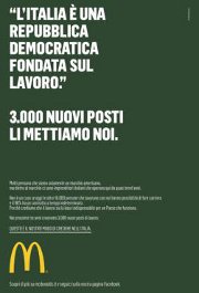 Parte la campagna e si scatena la polemica. E' il caso McDonald's. La catena di fast food, dopo aver lanciato in tv e sui principali quotidiani nazionali la campagna pubblicitaria per annunciare la creazione in Italia di 3.000 nuovi posti di lavoro nei prossimi tre anni, associandola all'articolo 1 della Costituzione “L'Italia è una Repubblica democratica fondata sul lavoro. 3.000 nuovi posti li mettiamo noi", si è vista 'recapitare' una dura replica della Cgil che ha criticato l'iniziativa come ingannevole."L'80% dei lavoratori, non certo per scelta, ha un contratto a tempo parziale di poche ore settimanali, con il sistematico obbligo di prestare servizio in orario notturno, domenicale e festivo", sottolinea Filcams-Cgil a Repubblica. Il sindacato ha poi evidenziato come prima della crisi i contratti fossero di 30-40 ore alla settimana, contro le 18-20 o addirittura 16 degli ultimi anni.