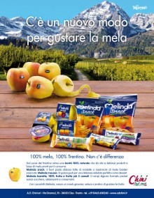 Dal mese di aprile, l’azienda Chini, specializzata in prodotti trasformati a base di mele, è on air con la nuova campagna stampa finalizzata a promuovere mousse, barrette e snack a marchio Melinda. Il concept di comunicazione si fonda su un messaggio che punta ad esaltare la naturalità e la qualità degli ingredienti che nascono nel cuore del Trentino. L’headline della campagna “C’è un nuovo modo per gustare la mela” vuole evidenziare quanto i prodotti trasformati rappresentino un’alternativa veloce, pratica e soprattutto naturale al consumo di frutta.