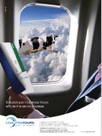 Il visual gioca sul contrasto tra l’immagine di un manager elegante che sta viaggiando comodamente e quella ironica di una mucca volante visibile dal finestrino, che identifica con un linguaggio visivo surreale le sorprese riservate da un viaggio organizzato male. Il concetto viene ulteriormente ripreso dalla headline: 'Soluzioni per il business travel, efficienti e senza sorprese'.