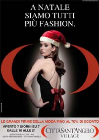 La campagna natalizia riprende l’idea creativa delle due parentesi del logo portate nel visual, un’idea che ha caratterizzato la campagna di lancio, e ormai diventata un format distintivo e di grande memorabilità per la comunicazione del Città Sant’Angelo Village. In questo caso al loro interno compare una affascinante ragazza in versione 'natalizia' che con aria un po’ snob accompagna il titolo della campagna: 'A Natale siamo tutti piu’ fashion'.