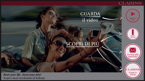 Per Loretta Varani, Marketing Director di Clarins Italia: “ La visione pionieristica della bellezza è un tratto distintivo di Clarins, che dal 1954 propone formule che attingono dalla natura i principi attivi più performanti per risultati visibili, e un rivoluzionario metodo di trattamento in Istituto 100% manuale. Dopo 10 anni di ricerche, oggi Clarins propone un concept e una formula ancora una volta rivoluzionari: i nuovi Booster - Energy, Repair e Detox - acceleratori di bellezza; gocce di attivi superpotenti da mixare alla crema quotidiana per aumentarne l’azione, in funzione di bisogni, stile di vita e desideri individuali. Per comunicarli alle consumatrici, abbiamo scelto un format impattante e innovativo, tutt’altro che classico: il banner interattivo ha, infatti, permesso di scoprire le novità e l’universo Clarins, offrendo la possibilità di scriversi direttamente alla Newsletter. I nuovi Booster Clarins non potevano trovare vetrina migliore per conquistare il pubblico! ”