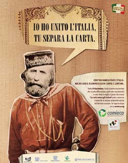 Per parlare della storia della carta che da 150 anni è legata a quella dell’Italia, è stato scelto come 'testimonial' Garibaldi, che nell’adv afferma: 'Io ho unito l’Italia, tu separa la carta'. Un modo per dire che riciclare è un impegno dal valore civico.