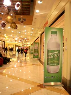 I Totem bifacciali presentano l’immagine della bottiglia di latte e presidiano tutti gli ingressi dei Centri e i percorsi pedonali nei punti in cui sono in grado di suscitare l’attrazione più efficace.