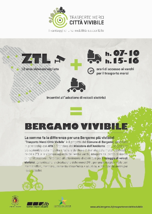 'Trasporto merci città vivibile' è il progetto del Comune di Bergamo, promosso in partnership con ATB e finanziato dal Ministero dell’Ambiente per una gestione più sostenibile della mobilità urbana e dei flussi di transito delle merci. Nell’ambito del progetto è stata presentata la nuova campagna di comunicazione. La campagna on air dal 18 settembre al 20 ottobre sarà veicolata attraverso flyer promo-informativi, una campagna di visibilità sugli autobus (all’esterno su tabelle laterali e all’interno attraverso appendini) e online mediante una campagna banner.