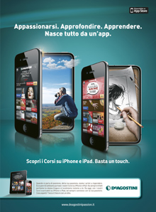 De Agostini, storica casa editrice italiana, ha scelto di affidare ad Hi! Roma, l’agenzia guidata da Roberto Marchionni e Giovanna Paolini, la comunicazione di un’anteprima assoluta: il lancio delle applicazioni iPhone e iPad per i Corsi di “Fotografia digitale” e “Disegna Manga e Anime”. La campagna, on air su web, mobile e sui principali quotidiani nazionali, invita a rimanere connessi con le proprie passioni e viverle in ogni momento grazie ai Corsi digitali De Agostini. Un visual diretto e suggestivo, due iPhone “aperti” sul mondo dei Corsi, rafforzati dalla headline: “Appassionarsi. Approfondire. Apprendere. Nasce tutto da un’app”.