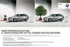 Il visual, costruito con la logica del side by side, ritrae due vetture BMW identiche, affiancate ciascuna da una palina che riporta la didascalia “BMW Serie 3 Touring” per l’auto di sinistra e “BMW Serie 3 Touring Premium Selection” per l’auto di destra. L’unico elemento che muta all’interno dei due visual è un albero, appena nato nel caso della prima vettura e già cresciuto nel caso della seconda. La head line recita “Il tempo passa per tutto tranne che per una BMW”.