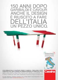 Cassina, brand del design italiano, celebra i 150 anni dell’Unità d’Italia con il progetto Sessantuna, opera firmata da Gaetano Pesce: 61 tavoli, tutti pezzi unici e diversi tra loro, che riuniti insieme formano la penisola italiana. Ogni tavolo riporta la firma del maestro ed è numerato nell’ordine cronologico in cui ciascuna area è entrata a fare parte del nuovo stato. Per festeggiare sia l’Unità che l’Unicità d’Italia, Cassina realizza un annuncio stampa pianificato sulle 5 ultime pagine di 5 importanti quotidiani nazionali (Repubblica, Corsera, Mattino, Messaggero, la Stampa) che, come ciascun tavolo, rappresentano parti diverse della penisola, con i suoi contrasti, le sue diversità, i suoi differenti punti di vista.