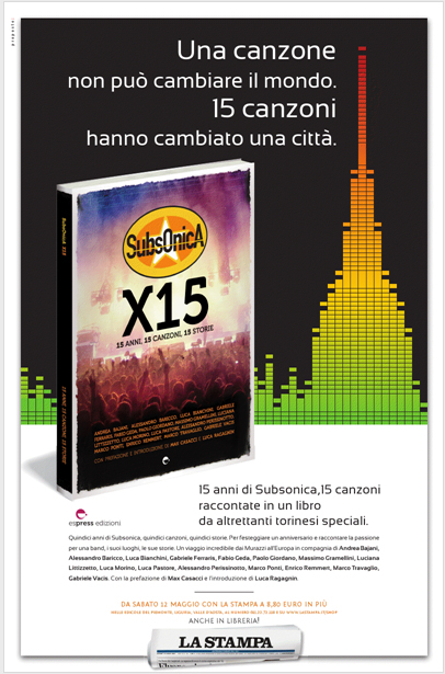 "x15" è una pubblicazione di 15 racconti "torinesi" ispirati alle canzoni dei Subsonica, che avrà lo scopo di celebrare 15 anni della band "fenomeno" degli anni 90. La campagna stampa sarà diffusa su La Stampa Nazionale e Torinosette e Il volume sarà reperibile da Sabato 12 Maggio, presso le edicole di Piemonte, Liguria e Valle d’Aosta a 8,80 € più il prezzo del quotidiano.