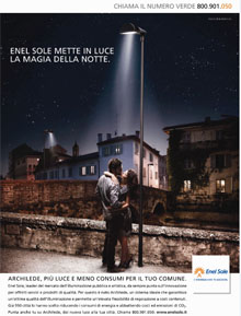 Nel buio di una città crepuscolare, la luce di Archilede - che già illumina le strade di oltre 950 città italiane - ci svela un bacio tra un uomo e una donna, soli su un ponte come se per una notte il mondo fosse tutto per loro. Il titolo che racconta questa immagine quasi di altri tempi 'Enel Sole mette in luce la magia della notte' . E’ questa l’idea creativa di Saatchi & Saatchi alla base della nuova campagna stampa di Enel Sole, la società di Enel che,. con circa 4 mila Comuni serviti e oltre 2 milioni di punti luce, è il maggiore operatore italiano nel settore dell’illuminazione pubblica e artistica.La strategia creativa di Saatchi & Saatchi parte dalla considerazione che le nuove tecnologie di illuminazione pubblica oggi sono fondamentali per rendere una città sicura, gradevole, ben illuminata e allo stesso tempo poter permettere al Comuni di risparmiare sulla “bolletta”. I nuovi sistemi di illuminazione a Led di Enel Sole, offrono i vantaggi di un sistema a lampade Led, dai consumi significativamente ridotti rispetto alle lampade tradizionali, garantendo un’ illuminazione ottimale, grazie ad una elevata flessibilità di regolazione che consente di modificare l’intensità luminosa in funzione di orario, condizioni di visibilità e altri parametri. Minori emissioni di CO2 grazie alla minore quantità di energia utilizzata a parità di illuminazione, significa dare un bell’aiuto ai bilanci dei Comuni.