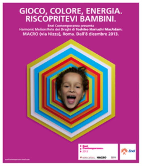 La campagna per Enel Contemporanea 2013, realizzata da Saatchi & Saatchi, parte proprio dall’alchimia che si crea nelle opere dell’artista tra arte e persone. Riprendendo quindi i materiali, i colori e le forme geometriche dell’opera originale sono stati realizzati degli artwork che sono stati utilizzati come cornice per dei ritratti di bambini e di adulti. L’idea esprime tutta l’energia che sprigiona l’opera dell’artista quando le persone la vivono e ne diventano parte. Il titolo “Gioco, colore, energia. Riscopritevi bambini” invita tutti a confrontarsi con le operte di Toshiko Horiuchi MacAdam per scoprire il lato ludico dell’arte.